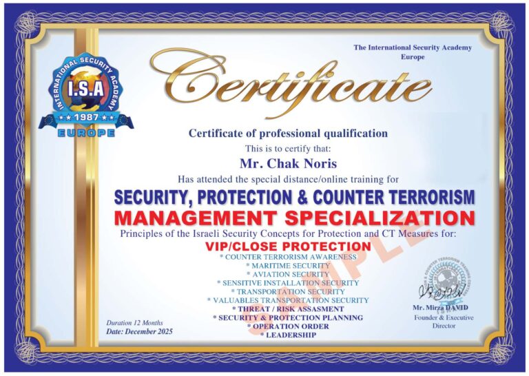 Only students enrolled and paying all the Distance / Online security program’s Modules will gain the ISA – ISRAEL certification stating the attendance of the student in the special training.